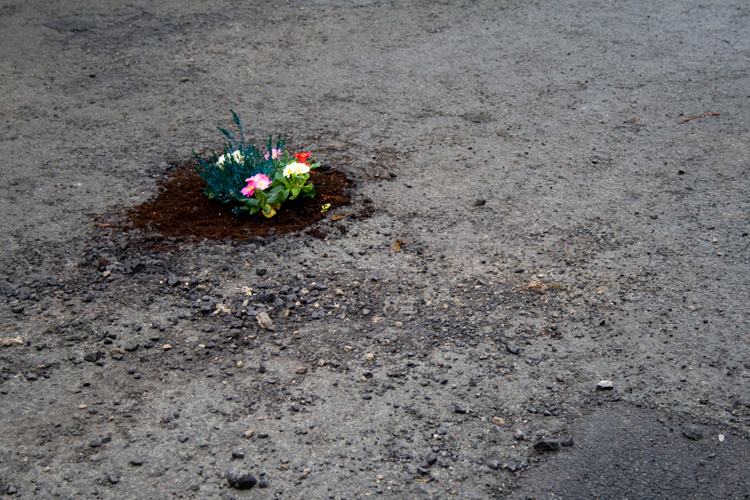 A series of public installations from Pete Dungey in Britain highlight the problem of surface imperfections on the roads. “If we planted one of those in every hole, it would be like a forest in the road.”